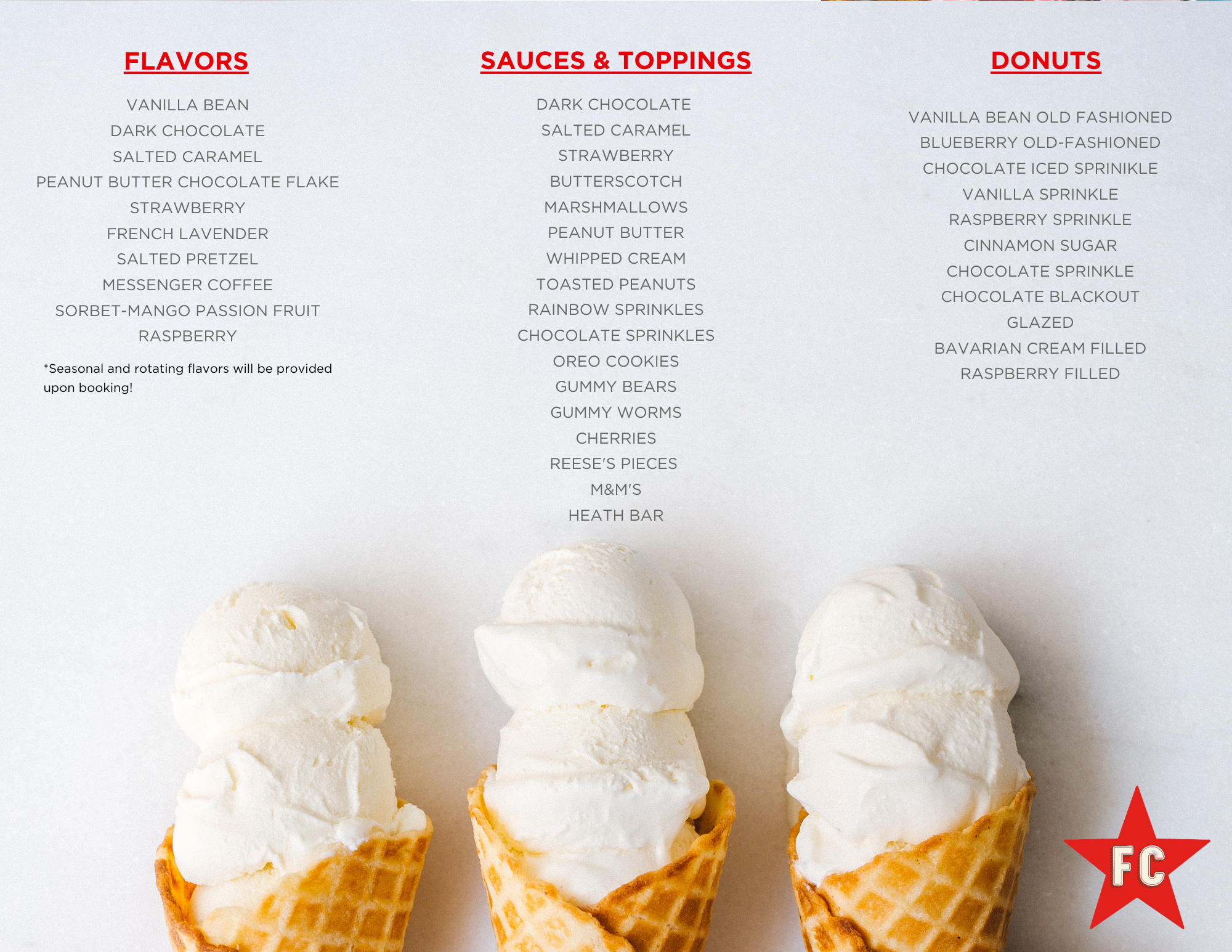 Up to 8 homemade ice cream & sorbet flavors of your choice, 4 Toppings of your choice, cups, spoons, donut boxes and everything needed for a speedy and successful service! A variety of cake and glazed donuts, 2 Fairway Creamery team members on-site to assist your guests during service for up to 2 hours.